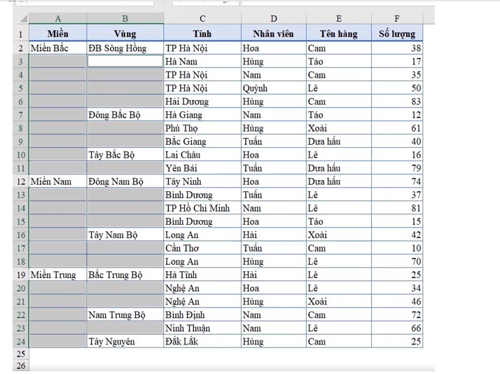 Bước 1: Bạn cần chọn các cột cần phải làm đầy dữ liệu. Ở đây là 2 cột Miền và Vùng nên chúng tôi sẽ lựa chọn vùng dữ liệu từ ô A1 đến ô B24.
