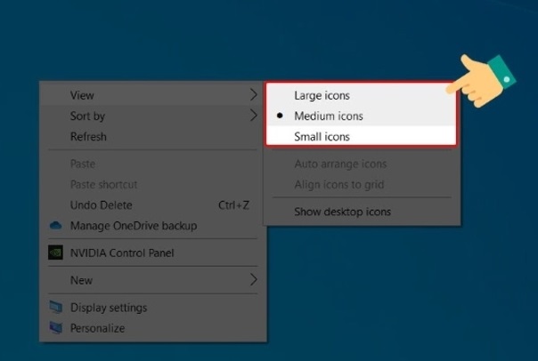 Đối với Windows 7 thì thao tác tương tự: Chuột phải vào một vị trí trống ở trên màn hình Desktop. Bạn Chọn "View". Tiếp đến Lựa chọn một trong 3 tùy chỉnh Small icons, Large icons, Medium icons.
