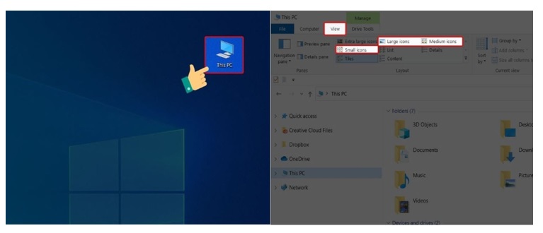 Bước 2: Bạn chọn tab "View". Bạn chọn một trong 3 tùy chỉnh Small icons, Large icons, Medium icons để có thể thay đổi kích thước biểu tượng.